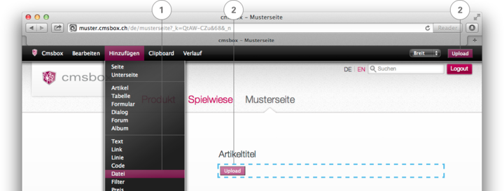 Beschriften Sie den Artikeltitel und fügen Sie anschliessend mit dem Befehl «Hinzufügen» «Datei» (1) ein Datei-Element ein. Klicken Sie auf den Button