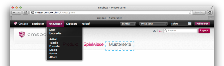 Haben Sie einen Menüpunkt oder den Seitentitel angeklickt, können Sie folgende Elemente hinzufügen: